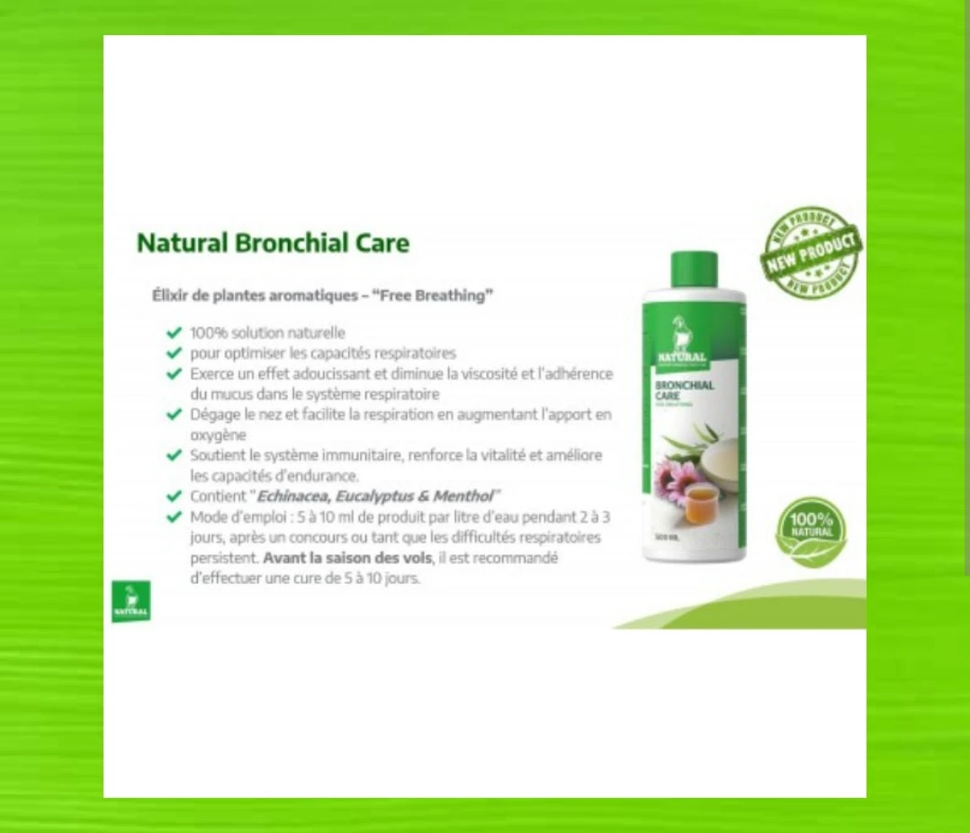 Deze Natural Bronchial Care help uw duif om zijn/haar neus vrij te houden en het beter te kunnen ademhalen. Dit product geeft een verzachtende invloed en vermindert de viscositeit en hechting van slijm in het ademhalingsstelsel. En ondersteunt de immuniteit, vitaliteit en uithoudingsvermogen van uw duif. Bevat de volgende ingrediënten eucalyptus, menthol en echinacea