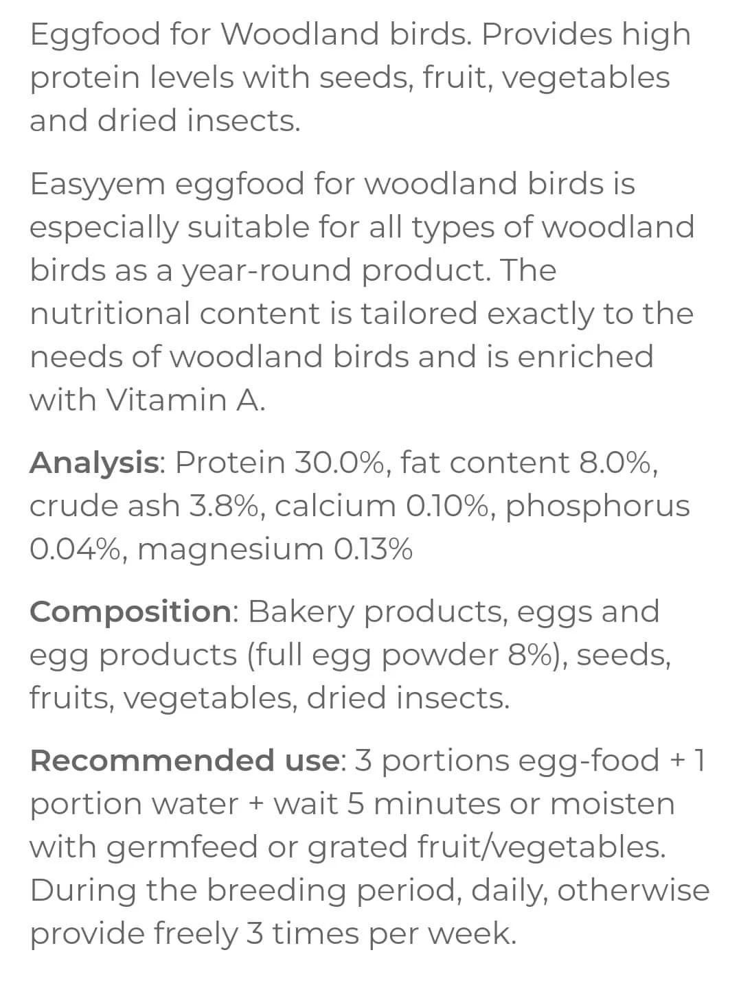 Compleet eivoer voor alle Europese cultuur vogels. Klaar voor gebruik. Bevat alle nodige voedingsstoffen en vitamines die uw vogel nodig heeft. Verrijkt met gedroogde insecten.