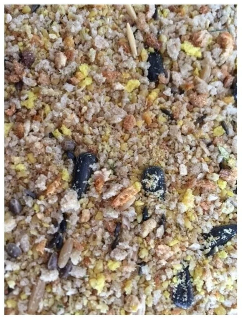 Samenstelling: Speciale bakkerijproducten, ei, Graan, Groenten, Plantaardig eiwit niet genetisch gemanipuleerd, Gedroogde insecten, vitamine-Mineraal-sporenelementen.