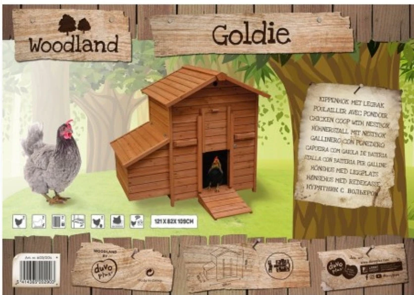 Het Woodland Goldie kippenhok biedt plaats aan maximaal 2 kippen. Het bevat een paaibak die gemakkelijk toegankelijk is vanaf de bovenkant van het kippenhok. Zonder een baars te vergeten om uit te rusten. Het kippenhok kan in elk kippenhok worden geplaatst. De kooi heeft 4 sterke handvatten voor gemakkelijke verplaatsing. Een mooi en groot huis voor de kippen!
