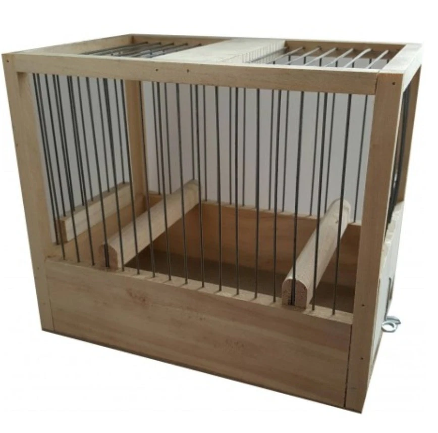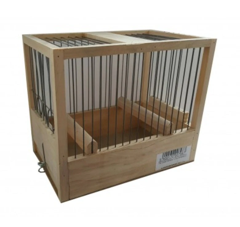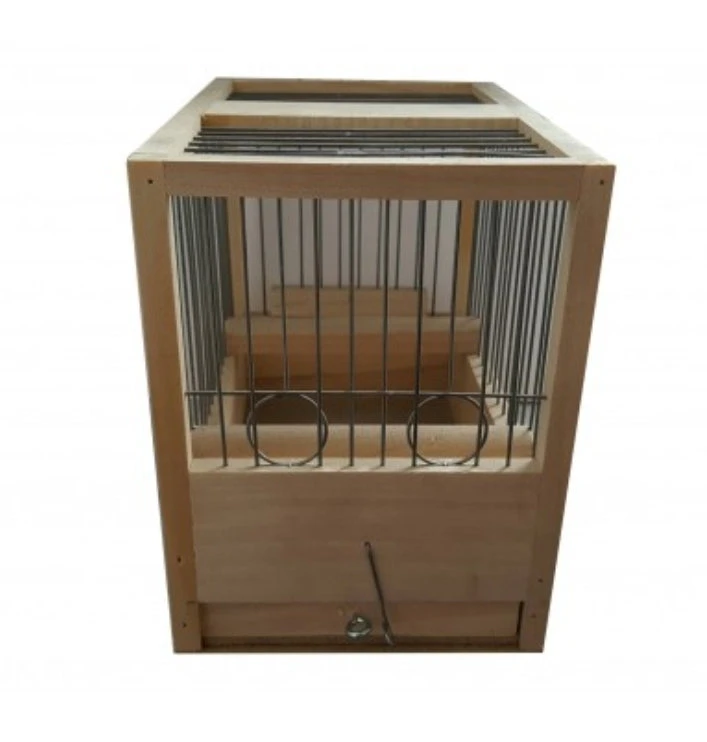 Houten zangkooi met 2 zitstokken en 2 gaten voor buitenvoeders. Heeft een lade in de bodem van de kooi.