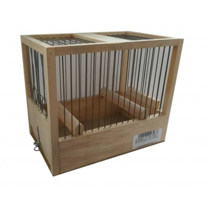 Houten zangkooi met 2 zitstokken en 2 gaten voor buitenvoeders. Heeft een lade in de bodem van de kooi.
