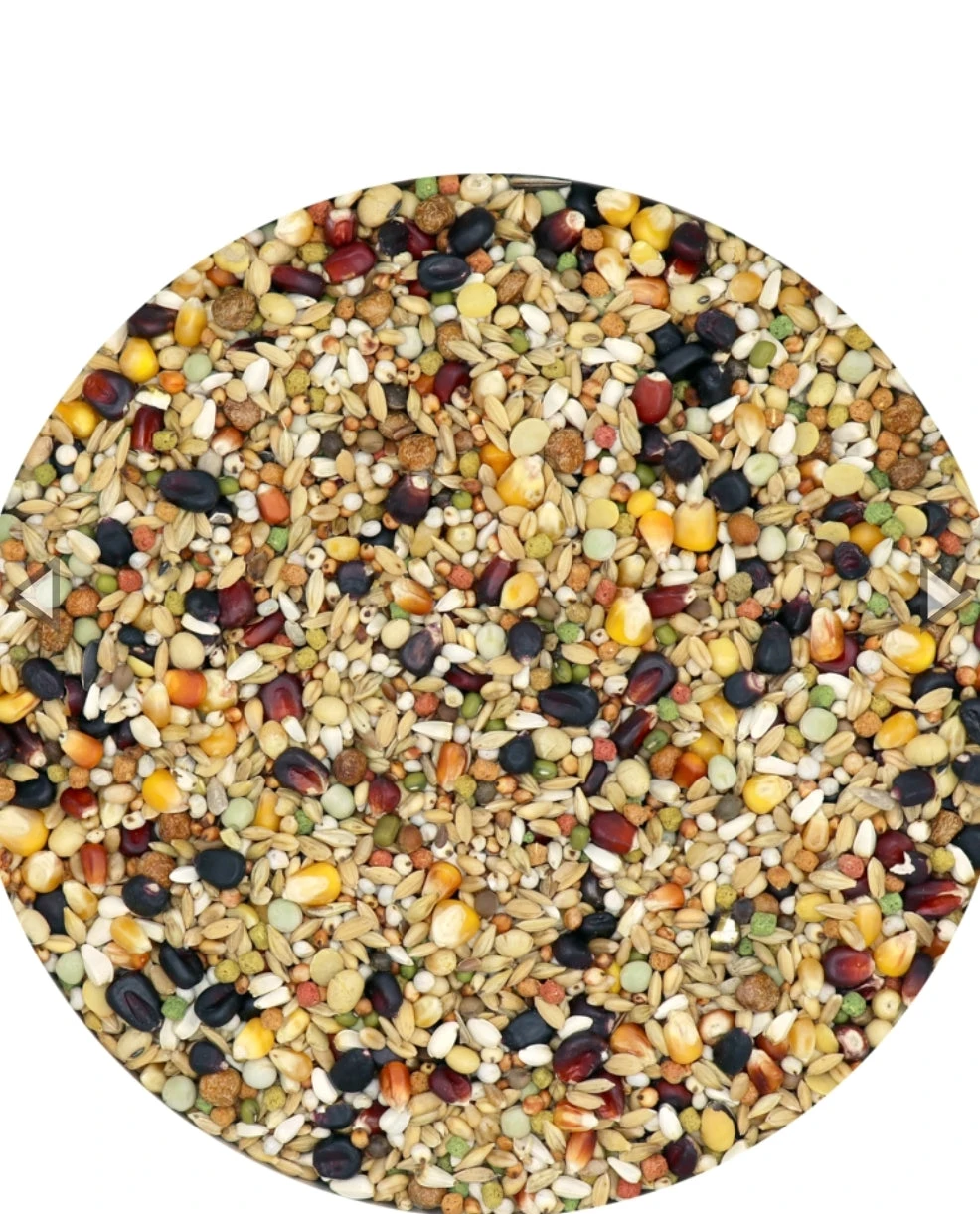 Zwarte maïs 1 % | Bordeaux maïs 4% | Rode maïs 4% | Premium cribsmaïs 4% | Kleine cribsmaïs 4% | Getoaste sojabonen 4% | Maple peas 4% | Kleine groene erwten 4% | Vitsen 2% | Katjang Idjoe 2% | Witte duiventarwe 8% | Witte dari 8% | Milo 8% | Cardy 8% | Duivengerst 8% | Paddy rijst 8% | Gepelde haver 2% | Bruin lijnzaad 2% | Geëxtrudeerde Juniorkorrel 6%.
