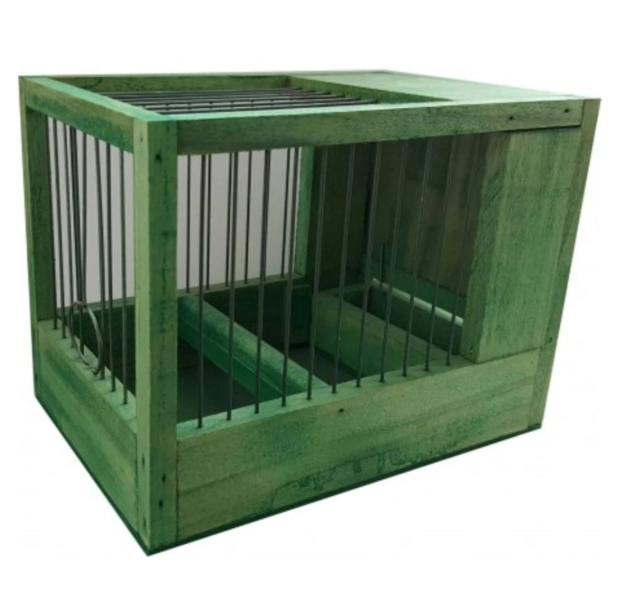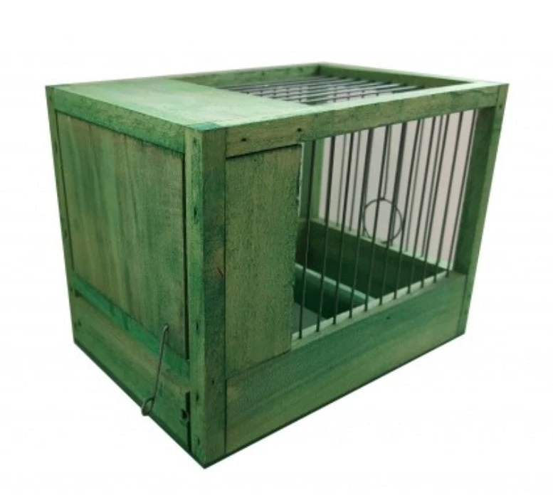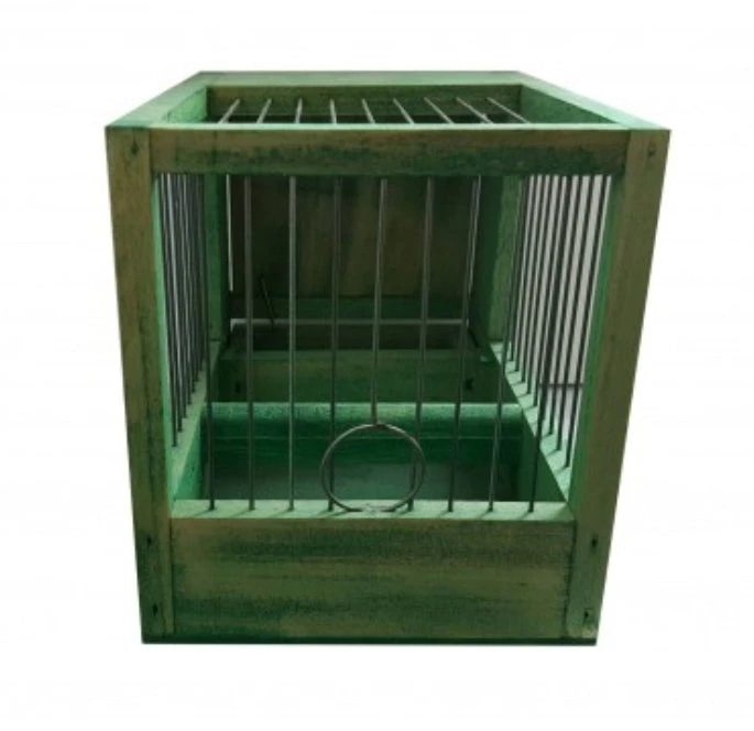 Groen behandelde houten kooi. Heeft een uitneembare houten bak die dienst doet als voerbak.