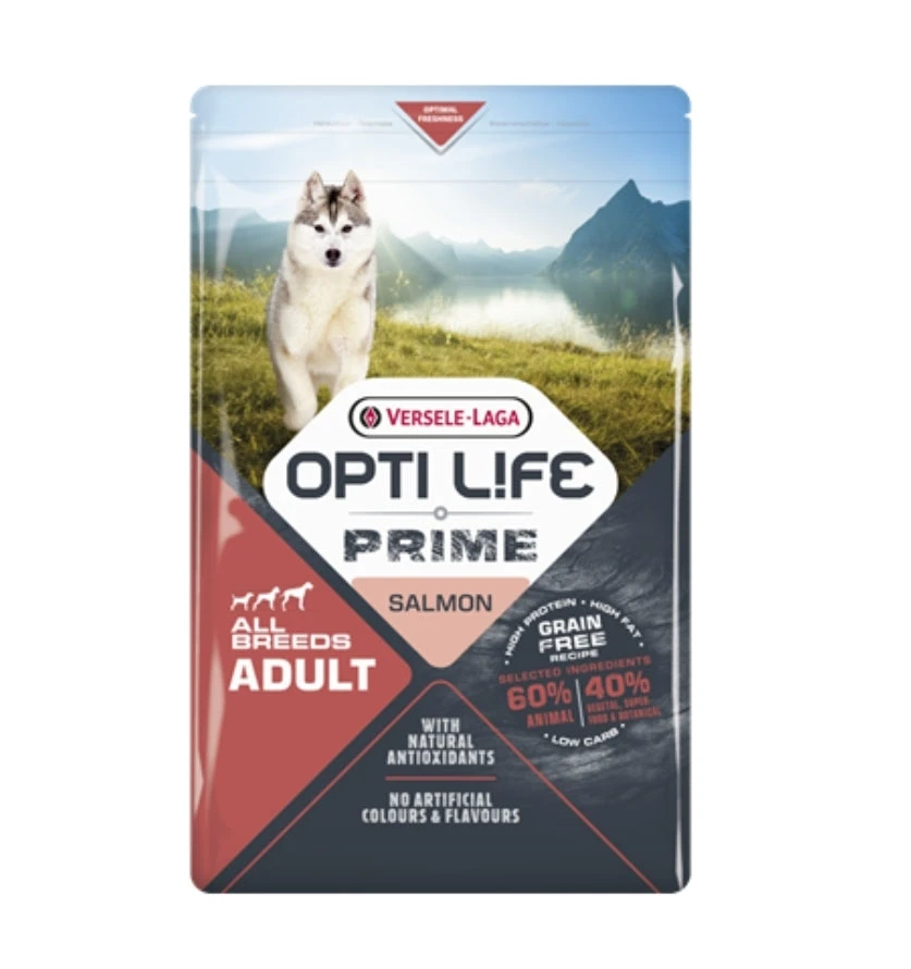 Met Opti Life Prime Adult Salmon geef je jouw hond een bijzonder rijke en heerlijke premium maaltijd, boordevol krachtige voedingsstoffen. Ons graanvrij recept is rijk aan eiwitten en vetten, en arm aan koolhydraten, met de ideale mix van de meest hoogwaardige, smakelijke en natuurlijke ingrediënten voor een dag vol avontuur.