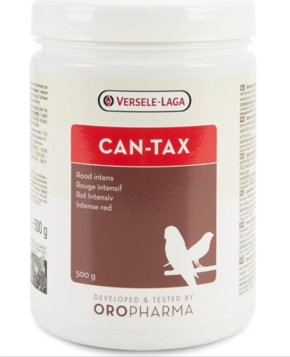 Versele laga Can-Tax is een rode kleurstof op basis van canthaxantine. Dit voedingssupplement kleurt rode kanaries, intensifieert bij andere vogels de rode kleur en verzekert een mooie egale rode kleur. Bij het toevoegen van Can-Tax aan de voeding wordt canthaxantine getransporteerd naar de plaats waar de veer groeit en krijgt ze een intensere rode kleur. Tot de vorming van een nieuwe veer behoudt de gevormde veer zijn kleur.
