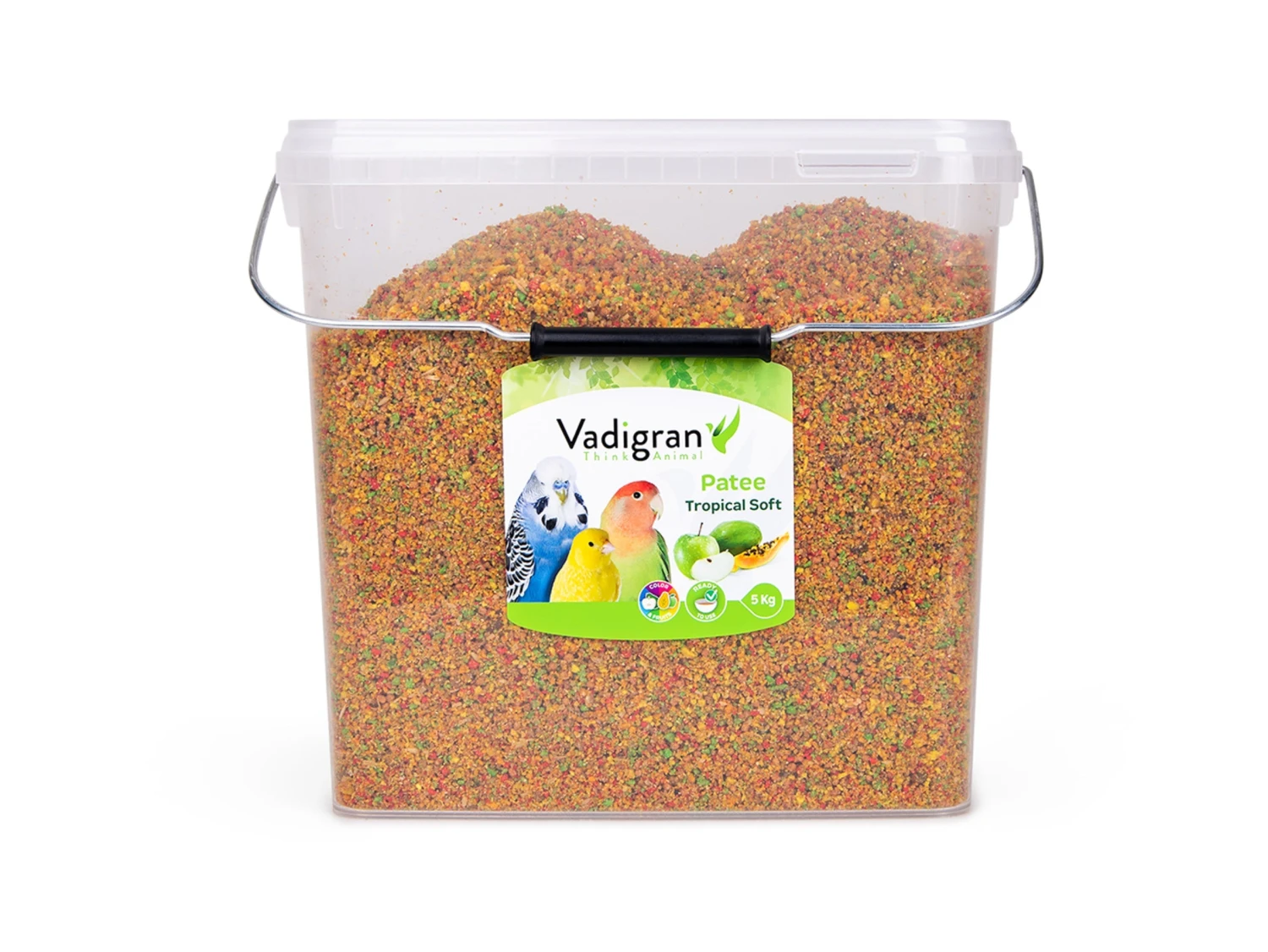 Tropical Patee Vadigran is een halfvochtige puree van uitstekende kwaliteit, klaar voor gebruik. Het bevat een verscheidenheid aan essentiële vitamines en mineralen en hoogwaardige eiwitten. Geschikt voor alle zaadetende vogels. Hersluitbaar verhoud emmer.