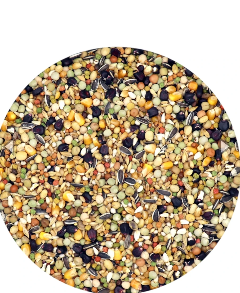 20 kg. Zwarte maïs 8%, Premium cribsmaïs 5%, Kleine cribsmaïs 5%, Getoaste sojabonen 5%, Dun peas 5%, Gele erwten 2%, Grote groene erwten 2%, Kleine groene erwten 8%, Vitsen 3%, Katjang Idjoe 2%, Witte duiventarwe 14%, Witte dari 4%, Milo 4%, Cardy 4%, Duivengerst 6%, Paddy rijst 4%, Gepelde haver 1%, Kleine gestreepte zonnebloempitten 2%, Kempzaad 2%, Kanariezaad 1%, Gele millet 1%, Bruin lijnzaad 2%, Raapzaad 1%, Zwart koolzaad 1%, Mariadistelzaad 1%, Wilde zaden 1%, Geëxtrudeerde Ruikorrel 6%