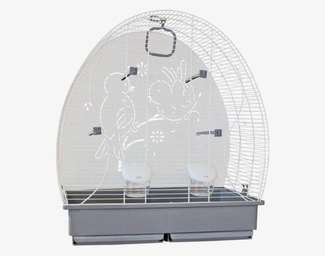 Vogelkooi geschikt voor de kleinere vogels, zoals parkieten, vinkjes en kanaries. De kooi heeft een mooi en strak design met een afbeelding van twee vrolijke vogels aan de achterwand. De kooi is voorzien van twee voer/drinkbakjes en twee stokjes. Aan de voorkant is de kooi voorzien van een deurtje.